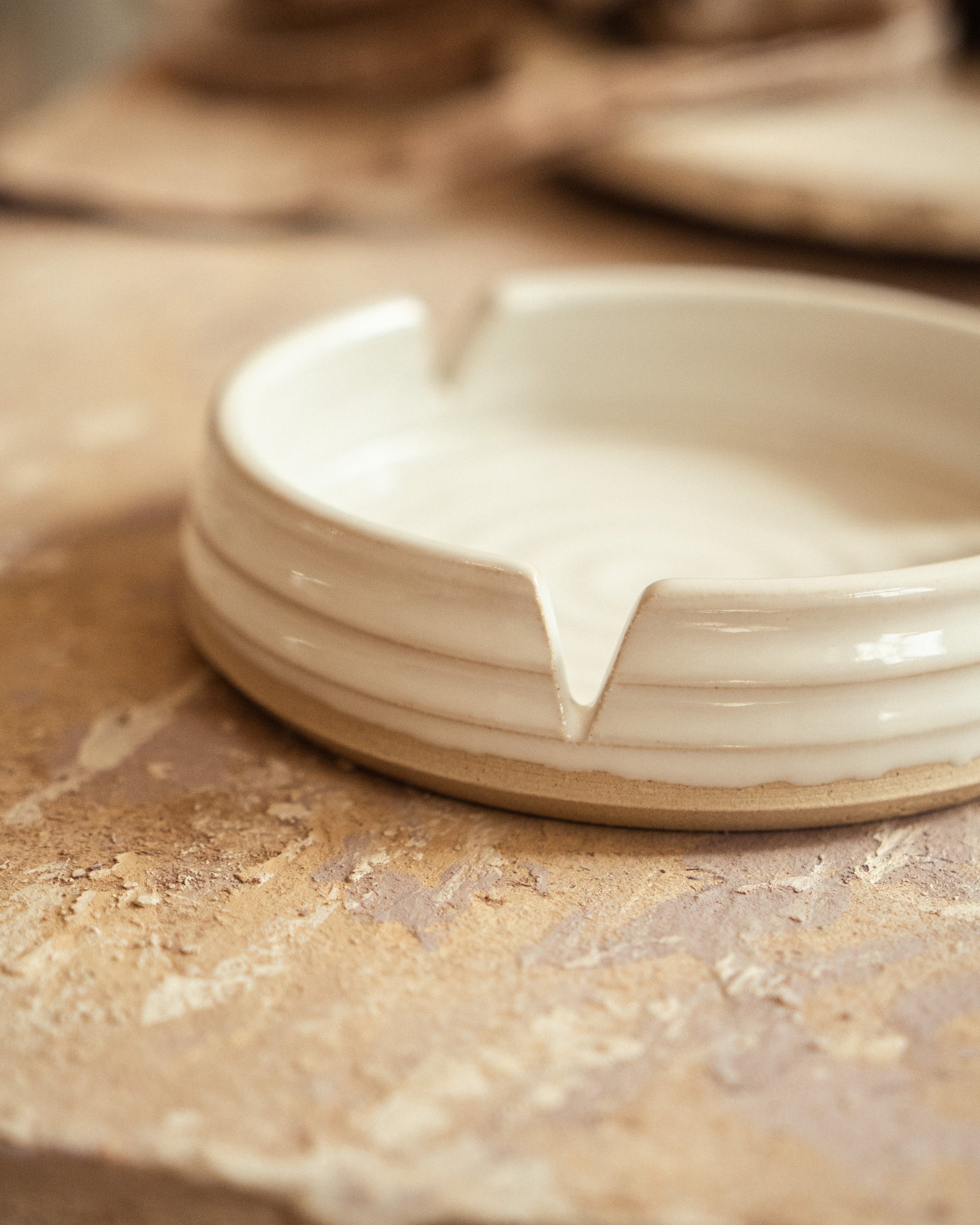 Deep well ceramic ashtray with notches.